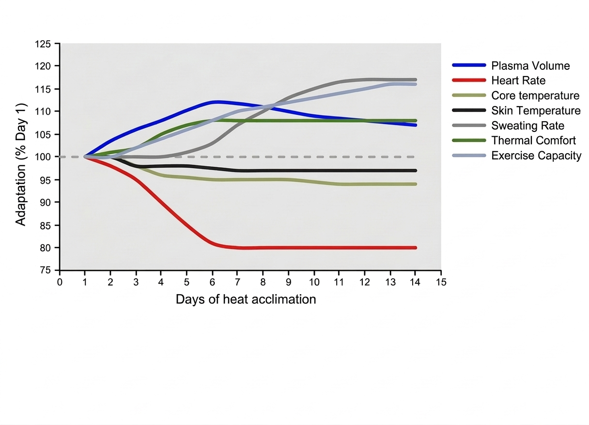 Heat acclimation drives a set of well-documented physiological adaptations. Plasma volume expands, meaning the cardiovascular system delivers oxygen more efficiently at a given intensity. Heart rate at a fixed workload drops. The sweating mechanism activates earlier and works more efficiently, dissipating heat before it accumulates. And most importantly for race day, core temperature during exercise is lower -- giving you more headroom before hitting your thermal limit.