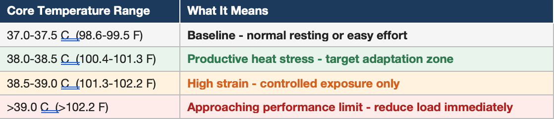 The practical value is this: instead of asking 'did I get hot enough today?', you know exactly where your core temperature was, for how long, and how that compares to last week's sessions. You can prescribe a heat session the same way you would prescribe a power-based interval -- with a target zone, a time-in-zone goal, and a measurable outcome.