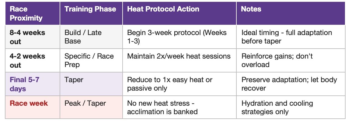 Taper the heat load in the final five days before any target race. Drop to one easy passive session or omit active heat entirely. The adaptation is fully banked -- the body needs recovery and readiness now, not more thermal stimulus.
